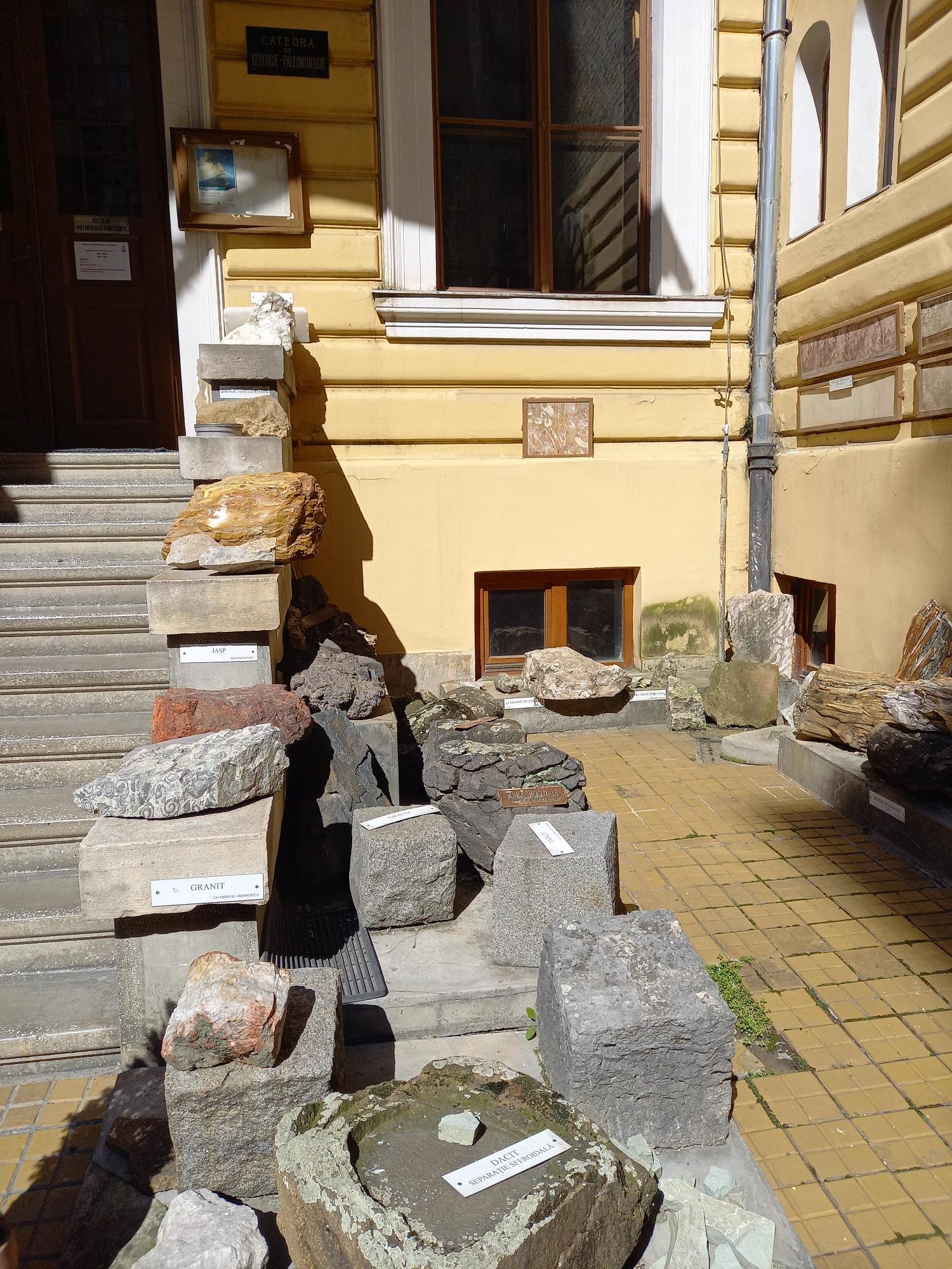 Colecția în aer liber este expusă în curtea interioară a Universității Babeș-Bolyai, la intrarea în Muzeul de Paleontologie-Stratigrafie. Această colecție cuprinde blocuri mari de roci eruptive, metamorfice și sedimentare, plăci lustruite de calcare fosilifere, folosite în construcții, formațiuni stalagmitice de peșteră, coloane impozante de bazalt (bazaltul de la Racoș, Munții Perșani), dar și concrețiuni de Feleac (Cluj), spectaculoase prin dimensiunile mari și morfologia diversă.