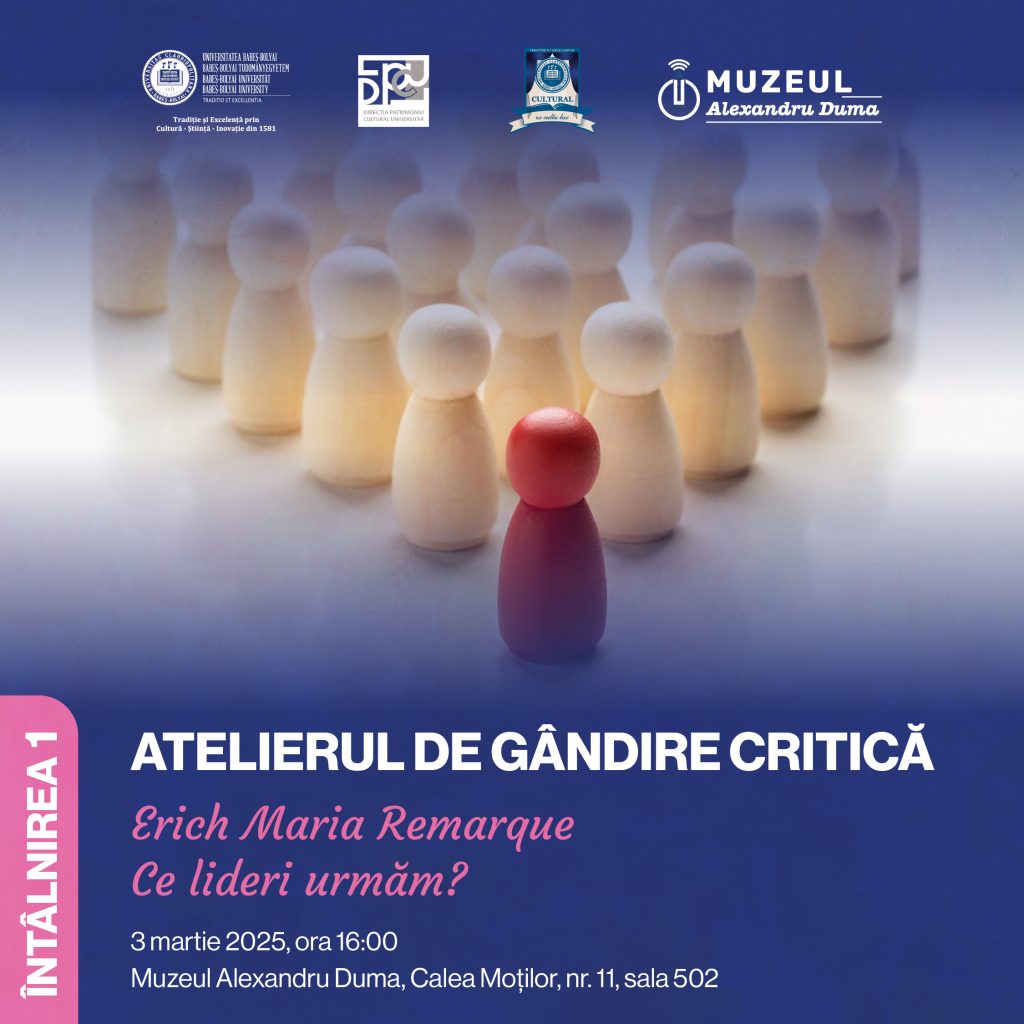 Prima întâlnire din cadrul seriei de primăvară a „Atelierului de gândire critică” de la Muzeul Alexandru Duma abordează o chestiune întotdeauna de actualitate, anume aceea a liderilor – pe care îi urmăm sau care am vrea să fim. Pornind de la experiența de pe front a celebrului scriitor Erich Maria Remarque, participanții la atelier vor avea ocazia să dezbată o serie de întrebări precum – Ce lideri existau în trecut? Cum se explică autoritatea, apoi declinul acestora? Ce lideri urmăm în prezent și de ce? Care sunt calitățile autentice ale unui lider? Cum ne exersăm gândirea critică atunci când urmăm instrucțiunile unui lider? – și alte întrebări care se vor ivi în cursul acestui dialog.