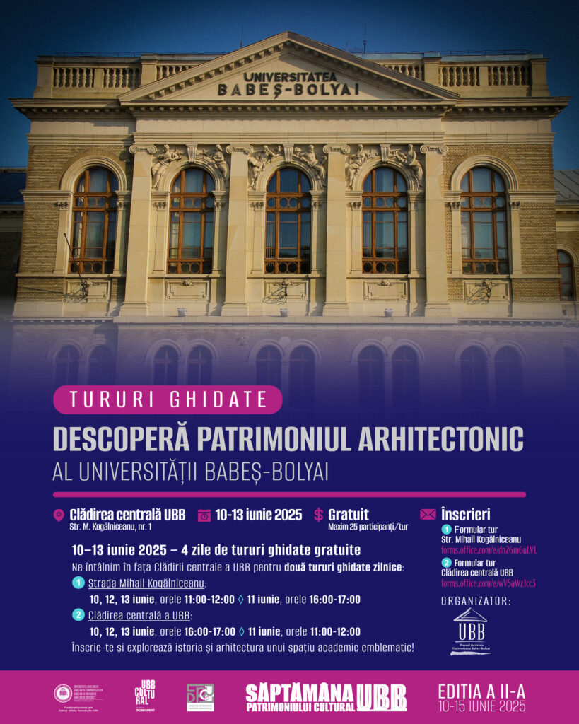 Direcția Patrimoniu Cultural Universitar a Universității Babeș-Bolyai, prin Muzeul de Istorie a Universității, organizează în intervalul 10-13 iunie 2025, cu ocazia „Săptămânii Patrimoniului Cultural UBB”, ediția a II-a, patru zile de tururi ghidate gratuite pe str. Mihail Kogălniceanu și în clădirea centrală a universității.