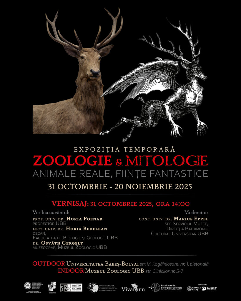Universitatea Babeș-Bolyai, prin Direcția Patrimoniu Cultural Universitar și Muzeul Zoologic, organizează expoziția Zoologie și mitologie: animale reale, ființe fantastice. Vernisajul va avea loc vineri, 31 octombrie 2025, de la ora 14:00, pe pietonala din față clădirii centrale a Universității Babeș-Bolyai (str. M. Kogălniceanu, nr. 1). Vor lua cuvântul: Prof. univ. dr. Horia Poenar, Prorector; Lect. univ. dr. Horia Ștefan Bedelean, Decan al Facultății de Biologie și Geologie; Conf. univ. dr. Marius Eppel, Șef Serviciul Muzee și dr. Osváth Gergely, Muzeograf din cadrul Muzeului Zoologic.